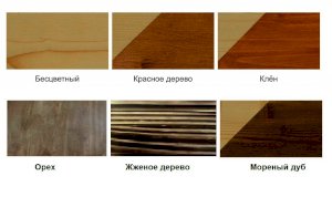 Цвета на выбор: бесцветный, клён, орех, красное дерево, морёный дуб, жженое дерево.