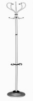 Фото напольной вешалки из оцинкованной стали с полимерным покрытием цвета под алюминий. Вешалка снабжена подставкой и держателем для зонтов. Данная модель вешалки идеально вписывается в интерьер современного кабинета.